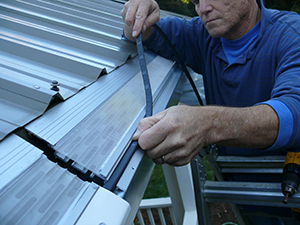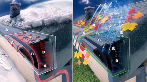 When it's raining or snowing, Icebreaker filters out leaves, pine needles and sand from your gutters! Melted snow in the winter, and rainwater in the fall and spring, are properly routed down your downspout so there are no rainwater erosion problems to your landscape! IceBreaker’s ice melting technology only needs one heat cable to melt the ice in and on your gutter! Saves on energy! You can harvest the snow with Icebreaker. The debris free melted snow can travel all the way to your rainwater storage tanks! No more gutters being ripped off your home from sliding snow and ice off your roof. Icebreaker is like a ski jump and the snow and ice just slide off leaving your gutters intact. Eliminates gutter cleaning and clogs forever! The Gutterglove Icebreaker offers uncompromised quality and strength to work with a vast array of roof types from heavy tile to super thick asphalt shingles. Design to fit on standard 5" gutters. Gutter Glove slips easily under the shingles of your roof and securely fastens to the front lip of your gutter. When installed at the same pitch of your roof, virtually all drebris slides off. Gutterglove is extremly rigid and won't crack, cave in your gutter or collapse over time. icebreaker Construction: Gutterglove Pro, Gutterglove Ultra and Gutterglove IceBreaker consists of two components, a perforated aluminum channel and type 316 stainless steel mesh. The stainless steel mesh is glued into grooves along both sides of each 5 foot aluminum channel section. It installs on any existing gutter. Gutterglove's specifications were designed so that it simply slips under the roof shingles and fits snuggly to the front lip of your gutter. Gutterglove should be installed at the same pitch as the roof to get the best performance of debris shedding off. gutterglove icebreaker Aluminum Channel Frame: Aluminum Channel Frame: The extruded aluminum support frame is anodized to further protect itself from the environment and to make it more adaptable to be installed on a copper gutter. The anodizing process converts the aluminum surface into an extremely hard, durable, corrosion resistant, long-lasting aluminum oxide finish. Anodizing also responds favorably to current governmental regulations because it is one of the most environmentally friendly industrial processes. Since this process is a reinforcement of a naturally occurring oxide process, it is non-hazardous and produces no harmful or dangerous by products. Anodized aluminum is used around the world as highly durable exteriors in commercial buildings such as one of the world’s tallest buildings, the Sears Tower in Chicago, Illinois. Other revolutionized uses are in scientific instruments, home appliances, satellites in space for harsh environmental protection, staircases in skyscrapers and a host of other uses. Gutterglove is the ONLY gutter guard in existence that uses an anodized extruded aluminum profile. Stainless Steel Mesh: The super-strong type 316 stainless steel mesh allows more than 150 inches of hourly rainfall to filter through to your gutter. Type 316 is molybdenum-bearing austenitic stainless steel which is more resistant to general corrosion and pitting/crevice corrosion than the conventional chromium nickel austenitic lower quality stainless steels such at types 302 and 304 or any other standard stainless steel alloys. The pots and pans manufacturers that are highly promoted at home and garden shows for their non-corrosive attributes are only type 304 stainless steel. The 316 alloy offers higher creep, stress-to-rupture and tensile strength at elevated temperatures. It also resists attack of marine and corrosive industrial atmospheres which makes it an ideal component for Gutterglove. Type 316 stainless steel alloy is widely used in the food, marine and medical industries. gutterglove ice dam gutter glove ice melting gutter glove icebreaker ice breaker gutter glove icebreaker gutterglove icebreaker